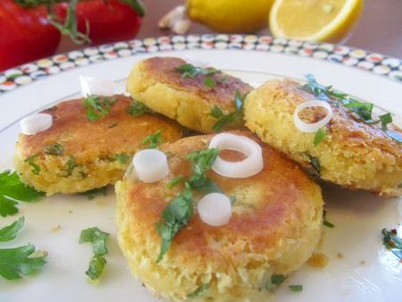 Лепим небольшие круглые котлетки и жарим в большом количестве оливкового масла, на среднем огне. Панировать эти котлетки ни в муке, ни в сухарях не нужно; масса получается достаточно плотной, лепится отлично и не разваливается в процессе жарения.