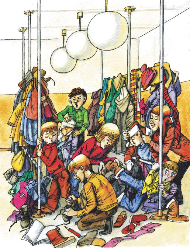 Наши шефы, шестой «А», соревновались с шестым «Б» – кто лучше и быстрее поможет одеться в раздевалке своим подшефным. И вот после звонка мы помчались в раздевалку, и тут началось это одевалочное соревнование. Два шестых уже ждали своих первоклассников. Очень строгое жюри устроилось на подоконнике, чтобы лучше видеть. Пятисотсвечовые лампочки вкрутили дополнительно к дневному свету. Самодеятельный школьный струнный оркестр расположился невдалеке. Оркестр грянул – и пошло! Ох, что тут было!