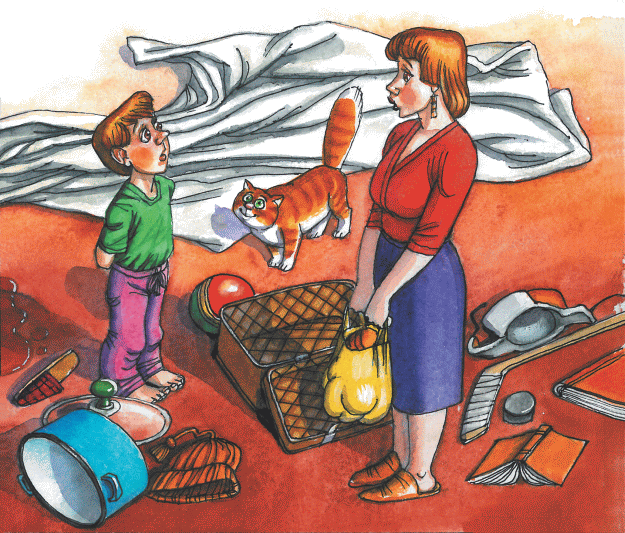 Тогда мы на шкаф закинули ещё три подушки, мамино пальто, все мамины платья, папины лыжи, кастрюльку, папины и мамины домашние туфли, много книг и ещё много всего. А кошка оттуда не прыгнула.