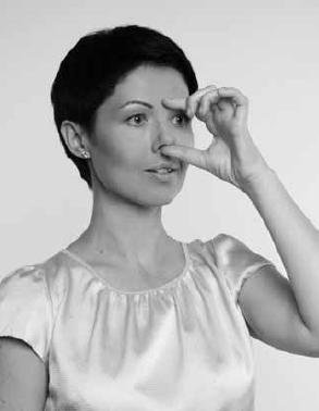 Указательный палец фиксирует область между бровями и слегка подтягивает ее вверх. Большим пальцем упираемся в кончик носа. У нас получилась своеобразная «прищепка», которая поможет нам проработать носовые мышцы более эффективно.