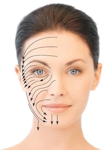 На фотографии линиями обозначено направление движения лимфы на лице. Все массажные движения в лимфодренажной технике будут направлены книзу. Начинается лимфодренажный массаж всегда с наиболее низко расположенной области. В технике, которую мы рассмотрим здесь, самомассаж начинается с области подмышечных впадин.