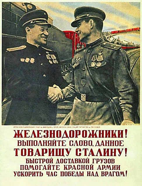 Появляются и другие агитационные плакаты, обращенные к железнодорожникам. Например: «Железнодорожники! Выполняйте слово, данное товарищу Сталину! Быстрой доставкой грузов помогайте Красной Армии ускорить час победы над врагом!». Эти плакаты способствуют укреплению трудовой дисциплины, развивают чувство ответственности за поставленные цели и задачи.
