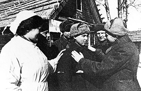 Воины Ленинградского фронта встречают выздоровевшего молодого бойца