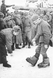 Красноармеец демонстрирует своим однополчанам немецкие эрзац-валенки на деревянной подошве