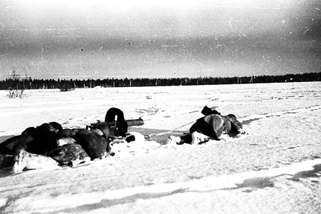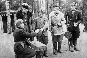 Советские пулеметчики пробираются к населенному пункту, занятому фашистами