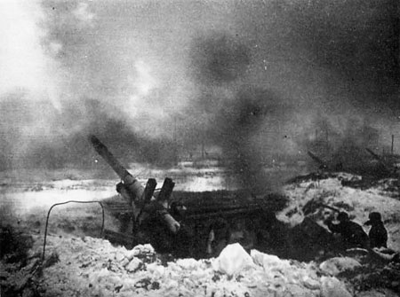 Советская артиллерия бьет из района Пулковских высот. 15 января 1944 года. Ленинградский фронт