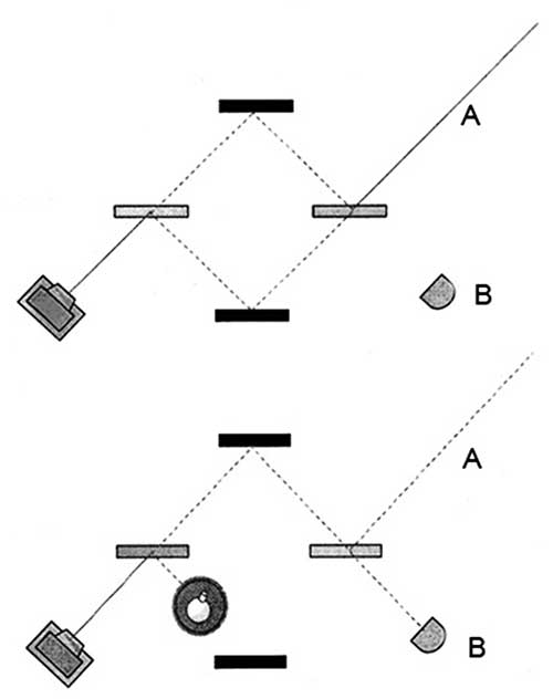 Фотон может двигаться от зеркала к зеркалу разными путями, и Элицур с Вайдманом рассмотрели, что будет происходить в каждом случае. В конце пути — это легко видеть на схеме — фотон будет зарегистрирован или детектором А, или детектором В, других возможностей нет. Какой из них сработает, зависит от хода лучей света в каждом конкретном эксперименте.