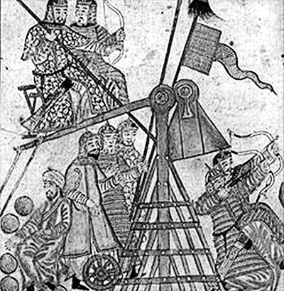 Тяжеловооруженные монгольские воины рядом с осадным орудием.