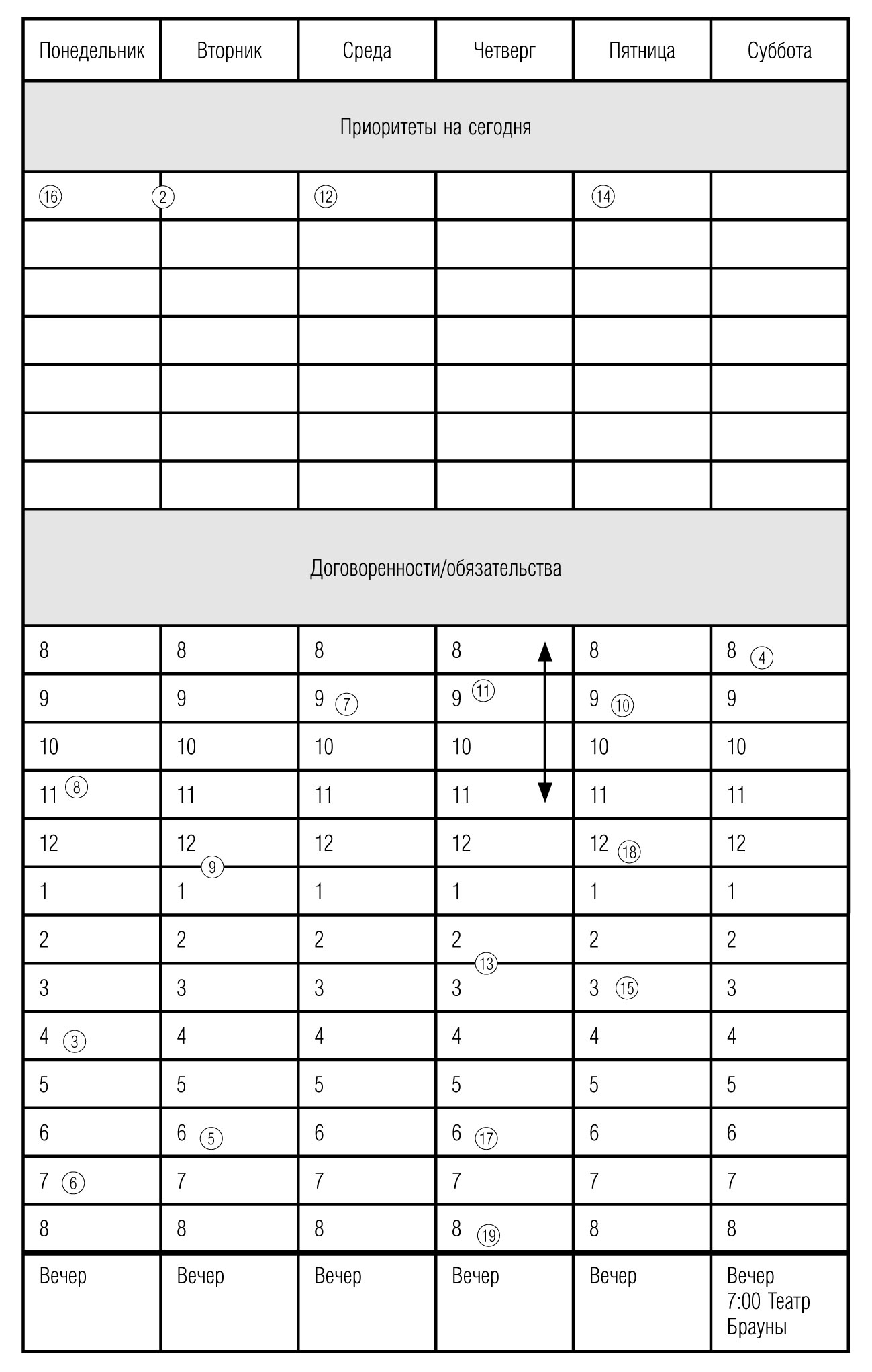 Если вы ставите перед собой цель обрести хорошую физическую форму путем упражнений, возможно, для осуществления этой цели вам потребуется выделять по одному часу три-четыре раза в неделю, а то и ежедневно. Одни цели могут быть достигнуты вами исключительно в рабочее время, другие – только в субботу или воскресенье, когда ваши дети дома. Ну как, вы начинаете замечать некоторые преимущества планирования недели по сравнению с планированием дня?