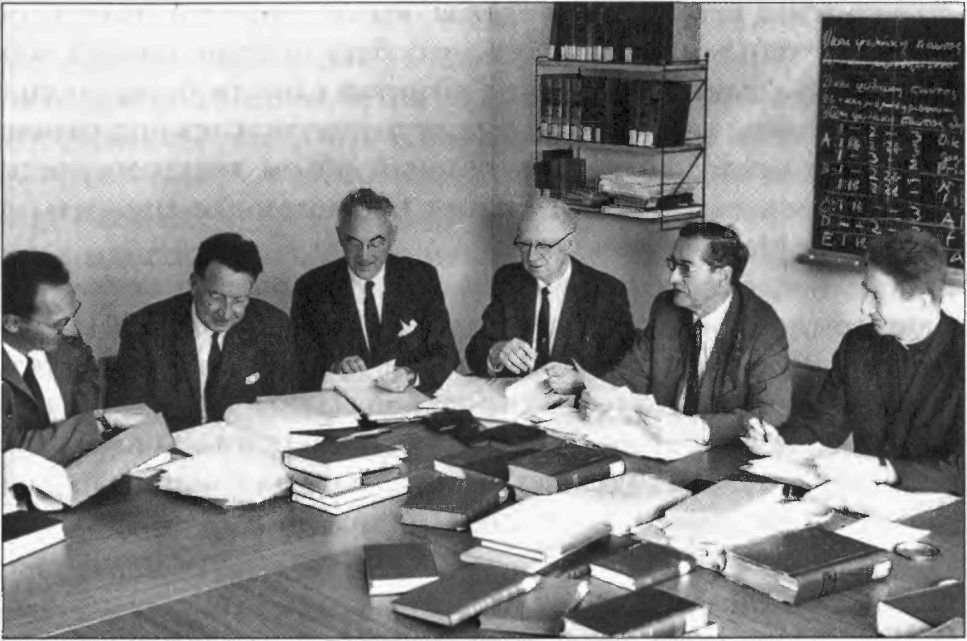 Рис. 24. Издательский комитет, подготовивший 2 и 3 издания греческого Нового Завета (Greek New Testament) Объединенных библейских обществ. Справа налево: Карло М. Мартини (Carlo M. Martini, S.J.), Курт Аланд (Kurt Aland), Аллен Викгрен (Allen Wikgren), Брюс М. Мецгер (Bruce M. Metzger), Мэттью Блэк (Matthew Black), ассистент Аланда Клаус Юнак (Klaus Junack).