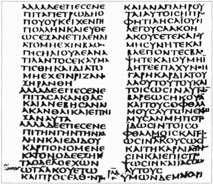 Рис. 2. Греческий маюскул (Синайский кодекс, IV в.). Ширина колонок порядка 5,5 см. Столб. а, Мф 13: 5-10, | | | | | | | | | | | | | | | | | | | | | | [вставка на полях слева] | ||. Столб. b, Мф 13:14–16, | | | | | | | | | | | | | | | | | | [ между строками] | | | | | | . Ссылка на канон Евсевия ( см. ) на полях между столбцами