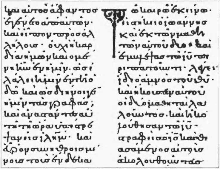 Рис. 3. Греческий минускул (лекционарий 303, XII в.). Ширина колонок порядка 8 см. Столб. а, Лк 24:31–33 | | ’ | | | | . | | | | ;| | | []-· | | ||. Столб. b, Ин 1:35–38, | | | | [] | | [] | | | | [] | [] | | .