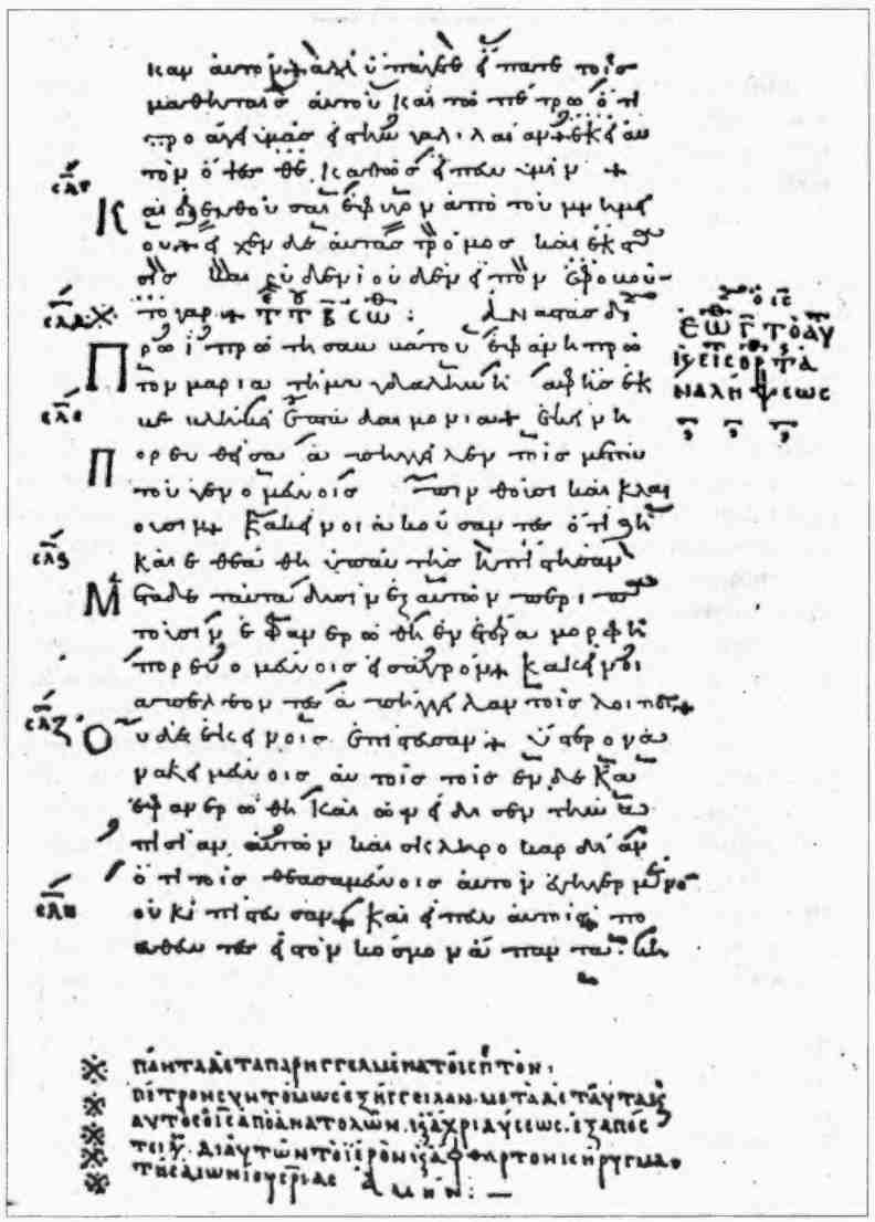 Рис. 25. Греческая рукопись 274 (X в.). Национальная библиотека, Париж. Мк 16:6-20 и промежуточное окончание Мк ( см. п. 2). Размер оригинала 23,8x16,5 см.
