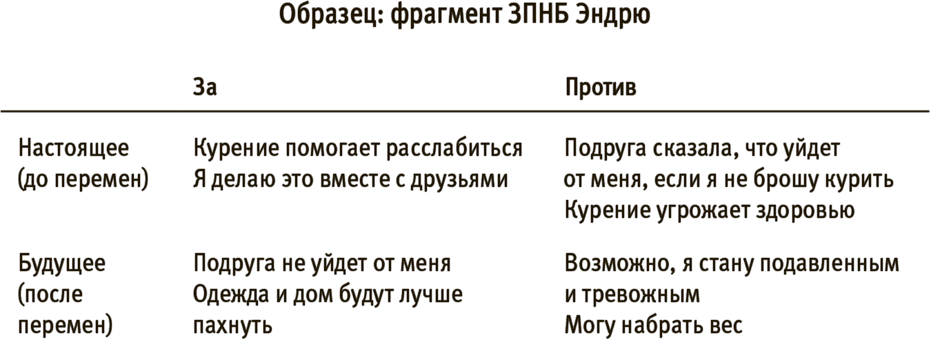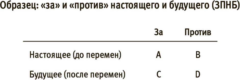 Итак, выясняя влияние какого-то явления на нашу жизнь, важно всесторонне изучить и цену, которую мы платим, и пользу, которую получаем. Работая с клиентами, я поняла, что помочь им увидеть картину целиком — наиболее эффективный шаг на пути к реальным переменам и преображению. Для этого познакомимся с тем, что я называю «за» и «против» настоящего и будущего (ЗПНБ).