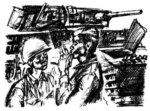 Он достал из кармана кисет и еще какую-то штуку, очень похожую на небольшой снаряд, Аккуратно скрутил козью ножку и, положив кисет и снаряд на брызговик танка, насыпал в козью ножку табак из ладони.