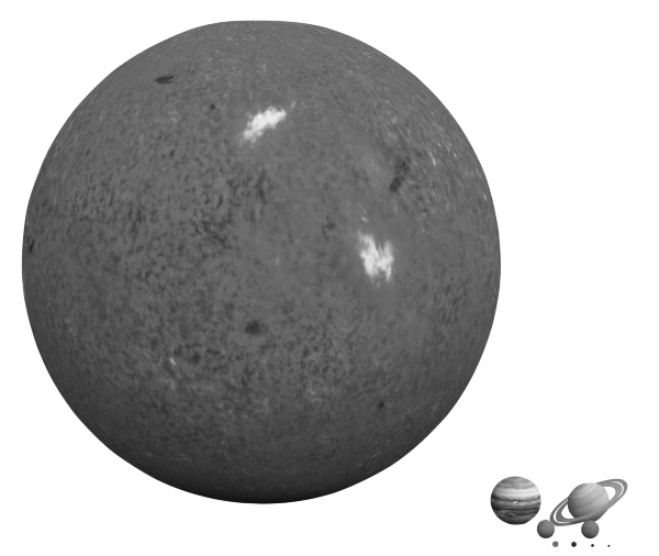 Рис. 4. Сравнительные размеры Солнца и крупных планет Солнечной системы. Земля – левая точка в нижнем ряду.