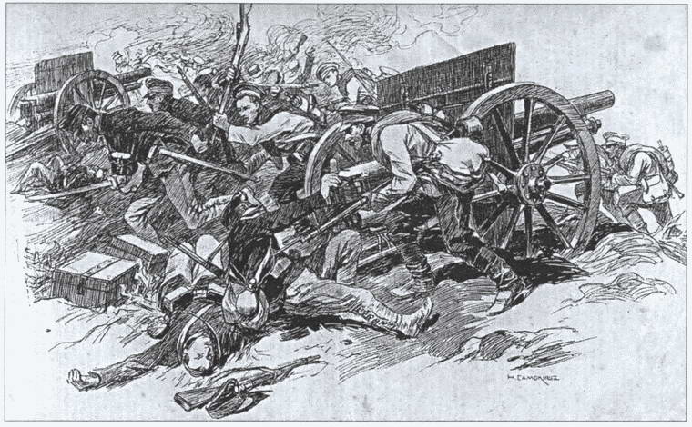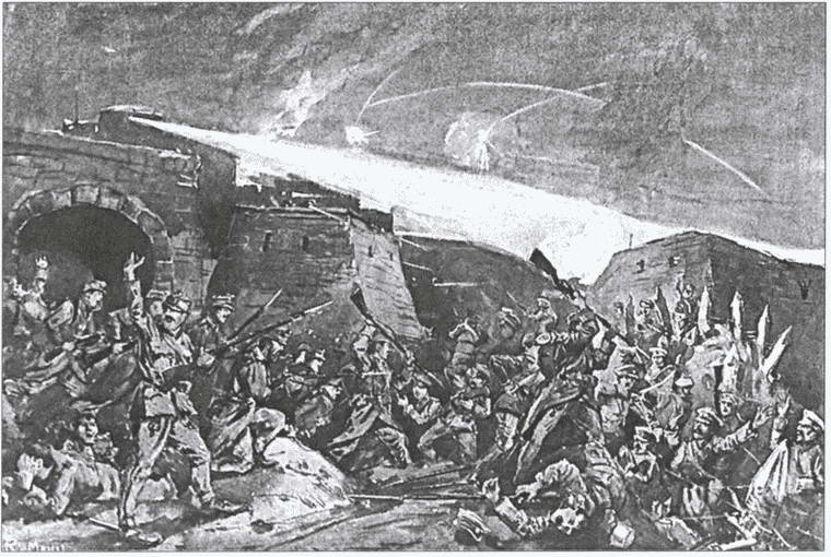 Русские войска штурмуют форт Седлиска, крепость Перемышлъ. Художник А. фон Майсль