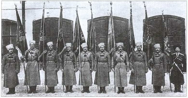 Русские военнослужащие со знаменами, захваченными в Эрзеруме