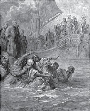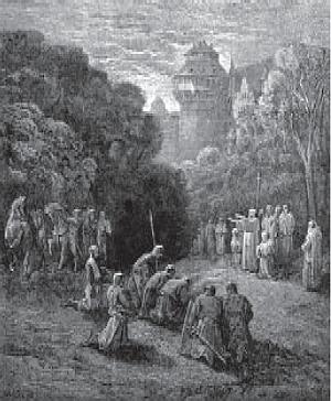 Первые нападения были направлены на башню, выстроенную посреди Нила; пущены были в ход всякого рода боевые машины, сделано было также несколько приступов. Башня, как видно из предыдущего, соединялась с городом посредством деревянного моста; таким образом, она получала помощь, при которой все чудеса храбрости оказывались бесполезными; после осады, продолжавшейся несколько недель, крестоносцы сделали нападение на мост и разрушили его; потом соорудили громадную деревянную крепость, которая была поставлена на двух судах, связанных вместе; на этой подвижной крепости избранные воины двинулись на приступ башни. Мусульмане с высоты своих стен, крестоносцы – с берегов реки следили глазами за христианскою крепостью; два судна, которые подымали ее, бросили якорь у подножия стен; сарацины осыпали их тогда градом каменьев и потоками греческого огня; воины Креста, бросившись на приступ, вскоре достигли зубцов башни. Среди битвы, в которой действовали мечи и копья, пламя вдруг охватывает деревянный замок крестоносцев, и подъемный мост, перекинутый на стены башни, колеблется; знамя герцога Австрийского, командовавшего атакующим отрядом, уже в руках осажденных! Крики радости раздаются в городе, продолжительный стон слышится с берега, где стоят крестоносцы. Патриарх Иерусалимский, духовенство, вся армия коленопреклоненно с мольбою воздевают руки к небу. Вскоре, как будто бы Богу было угодно внять их молитвам, пламя угасает, машина снова действует, надземный мост утвержден. Товарищи Леопольда возобновляют нападение с большим жаром; повсюду под ударами христиан рушатся стены; растерянные мусульмане складывают оружие и молят победителей пощадить их жизнь. Крестоносцы приготовлялись к этой победе молитвами, постом, религиозными процессиями. Видны были лики воинов небесных среди сражающихся; все пилигримы считали взятие башни делом Божиим.