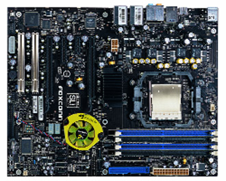 Желающим потратить на видеокарты примерно от $500 (лучше по столько – на каждую), стоит обратить внимание на плату Foxconn C51XEM2AA-8EKRS2H, основанную на старшем чипсете от NVIDIA. Она имеет все необходимое и достаточное для того, чтобы две видеокарты совместно работали с максимальной скоростью над рендерингом изображения в играх. О функциях чипсета мы расскажем в следующем номере, а по поводу данной платы можно сказать, что она поддерживает все актуальные на сегодня интерфейсы, в заведомо избыточном количестве даже для оснащенного по максимуму компьютера. Само собой, при сборке использованы не менее дорогие конденсаторы, а шестислойный дизайн печатной платы гарантирует отсутствие наводок и искажения высокочастотных сигналов. Плата была разработана в тесном сотрудничестве с NVIDIA и демонстрировалась на презентациях чипсета как образцовая (или «референсная»), то есть реализующая все возможности набора логики.