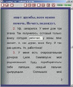 Именно в последней версии Cool Reader - 2.00.52a от 2 ноября - реализована корректная поддержка SAPI5-движков ScanSoft, поэтому «Катерина» отлично настраивается и регулируется. Единственное ограничение: заточен Cool Reader исключительно под чтение электронных книг (понимает форматы html, rtf, doc, txt, fb2 и автоматически распознает русские кодировки dos, win, koi-8, а также latin, utf-8 и unicode), поэтому ему невозможно скормить содержимое буфера обмена, как в TextAloud.