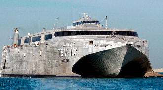 TSV-1X, Theater Support Vesллsel, невелик. Длина всего лишь 98 метров - как у яхты иного скоробогача. Полное водоизмещение - 1600 тонн. Полезная нагрузка - 600 "коротких" тонн[В кораблестроении/вождении используют архаичные англосаксонские меры веса, в том числе short tonne, которая эквивалентна двум тысячам фунтов, или 907,2 кг.]. Ход под дизелем Caterpillar 3618 marine оценивается в 45 узлов, дальность - в 4000 морских миль. Способен действовать непосредственно у берегов.