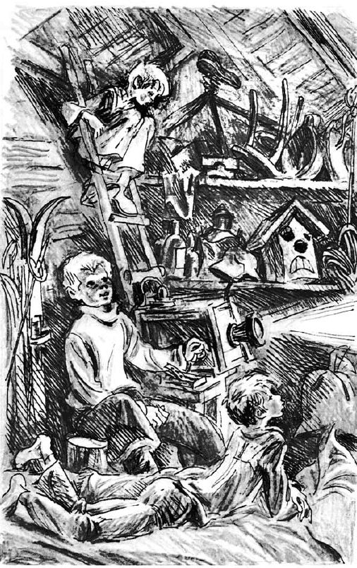 На полке пониже хранились инструменты Форика и всякие полезные железки. Здесь же лежала треснувшая немецкая каска и смутно выступала из сумрака голова Контуженого Семы… Кстати, следующей весной Форик так и не собрал Сему. Сказал, что неохота. А голову-скворечник прибил к шесту над забором. Скворцы не захотели селиться в щелястом жилище с тремя дырами. Однако эту жилплощадь охотно заняли воробьи. Ну что ж! Форик сказал, что и это неплохо: воробьям тоже где-то жить надо…