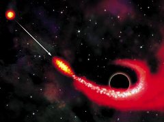 На фото: звезда, попавшая в поле тяготения массивной черной дыры, сначала разрывается на части приливными силами, а затем, в виде ярко светящегося сильно ионизированного газа, поглощается черной дырой. После такого «знакомства» от звезды остается лишь вращающееся вокруг черной дыры небольшое разреженное облако.