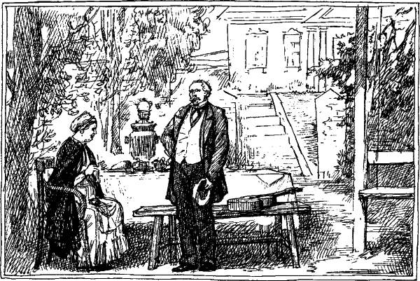 Марина (сырая, малоподвижная старушка, сидит у самовара, вяжет чулок) и Астров (ходит возле).