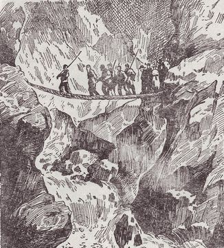 Около часу я плелся на поводу. Еще толчок — и я падаю на холодную, твердую землю. Под приглушенный говор меня привязали к чьей-то горячей спине. Шум шагов, люди уходят, с моей головы стаскивают покрывало, и, оцепенев, я вижу себя на дне пропасти.