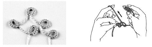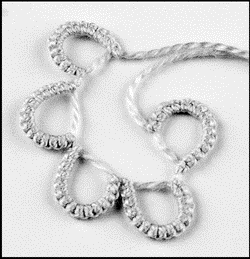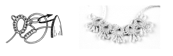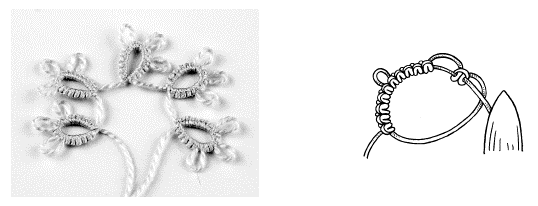 Этот элемент плетения выполняют с использованием двух челноков, когда на одной дуге нужно сплести кольцо (или несколько колец) рабочей нитью. Сплетите часть дуги до кольца, затем рабочую нить снимите с пальцев левой руки (оставьте в плетении только один челнок) и из рабочей нити вывяжите кольцо. После этого в плетение верните ведущую нить и уже двумя челноками доплетите дугу.