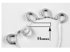 Это небольшой прямой участок одинарной нити при переходе от одного кольца к другому при плетении одним челноком. Обычно длина ножки примерно равна диаметру кольца (или полукольца), предшествующего ножке в кружеве (0,3–0,6 см).