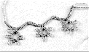 Если нить неожиданно обрывается, то, естественно, у нее не остается конца, чтобы подвязать следующую нить, и тогда последний элемент кружева нужно расплести. Для этого ножницами рассекают ведущую нить, на которой навязаны узлы фриволите.