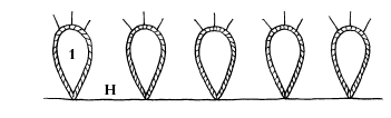 На схеме кольцо обозначено цифрой 1; в раппорте указано, что кольцо 1 (1 – к) плетется следующим образом: 6 двойных узлов, декора– тивное пико, 2 двойных узла, декоративное пико, 6 двойных узлов. Другие кольца на схеме не обозначены никакими цифрами – это значит, что они такие же, как и кольцо 1. На схеме видно, что кольца соединены ножкой. Из раппорта следует, что длина ножки составляет 0,5 см.