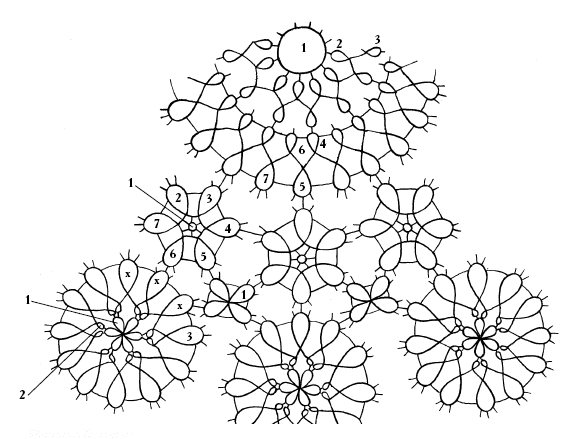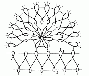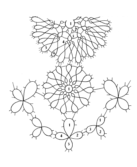 Сочетая в различных комбинациях элементы, выполняемые одним челноком – кольца и многолистники, – можно получить интересные варианты кружева. Но диапазон возможностей при использовании двух или нескольких челноков неизмеримо возрастает. Несколькими челноками работают тогда, когда в рисунке предусмотрено несколько цветов. Тогда для каждого цвета берут свой челнок.