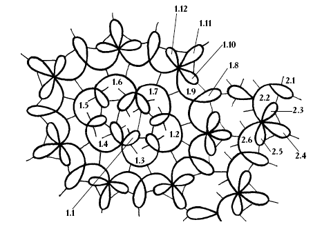 На схеме салфетки «Звезда» в первом ряду такие элементы, как кольца 1 и 2, ничем не примечательны, они совершенно обычные. Но дуга 3 интересна тем, что на ней находятся два кольца, которые не имеют между собой общей точки на дуге, но своими соединительными пико связывают первый и второй ряды салфетки.Обратите внимание и на необычный раппорт дуги: в его записи присутствуют три пары скобок. Это сделано для облегчения работы по раппорту. Скобки, расположенные внутри записи раппорта дуги, содержат раппорты колец, составляющих двулистник.