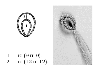 Выполнять элемент несложно и интересно. Порядок работы следующий: после выполнения колец 1 и 2 начинайте плетение дуги по раппорту, то есть свяжите четыре узла фриволите; работу не переворачивайте (!) – дуга остается выпуклой частью наверх. Затем снимите с пальцев левой руки рабочую нить, подтяните дугу ведущей нитью (ведущая нить для вязания кольца не понадобится, поэтому челнок с ведущей нитью просто свободно свисает).