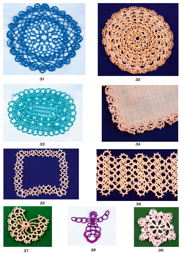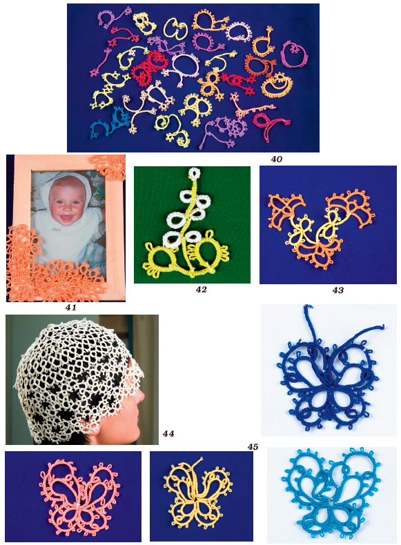 31 – салфетка «Цепочки»; 32 – салфетка «Фельтон»; 33 – салфетка «Бублик»; 34 – оплетка «Почти меандр»; 35 – оплетка «Хлебная корзинка»; 36 – дорожка на стол; 37 – фестон «Колыбельки»; 38 – «Фиолетовый ангел»; 39 – снежинка 40 – буквы; 41 – рамка «С днем рождения»; 42 – ландыш; 43 – королевские лилии; 44 – шапочка; 45 – бабочки