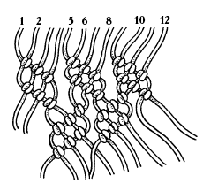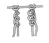 Закрепите на основе две двойные нити, причем боковые нити (рабочие) должны быть длиннее внутренних нитей (нитей основы) в четыре раза. Крайними нитями поочередно набрасывайте односторонние петли на основу с правой и левой сторон.