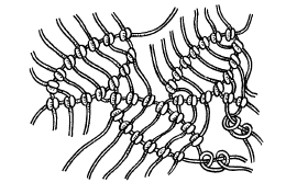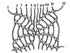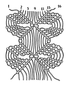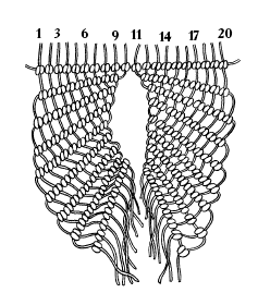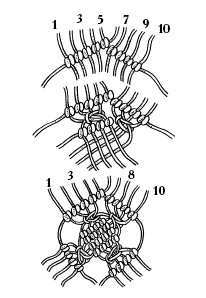 Разделите количество нитей пополам. Выполните на нитях 1 и 16 по диагональной бриде к центру и по шесть диагональных брид, располагая их веерообразно: справа – три бриды слева направо, три бриды справа налево; слева – три бриды справа налево, три бриды слева направо.