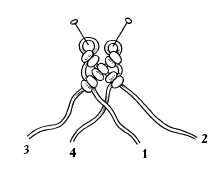 Две нити – четыре конца перегните пополам и место сгиба заколите булавками на рабочей подушке. Правой рукой натяните левую крайнюю нить, завяжите на ней вторым концом репсовый узел, затем левой рукой натяните правую крайнюю нить, выполните три репсовых узла и еще один узел нитью 4 на нити 3.