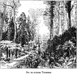 Стоянка оказалась чрезвычайно плодотворной в смысле сбора всякого рода материалов. Лабийярдьер, изумленный разнообразием природы этого уголка Тасмании, не переставал восхищаться огромными лесами с поистине гигантскими деревьями, бесчисленными кустами и неведомыми травами, сквозь которые ему приходилось прокладывать себе путь. Во время одной экскурсии, совершенной им в окрестностях бухты, он нашел прекрасные образцы бронзово-красного гематита, [152] а несколько дальше охру ярко-красного цвета, указывавшего на присутствие железа. Вскоре он встретил туземцев; сведения, сообщенные им об этом ныне совершенно исчезнувшем народе, [153] настолько интересны, что мы считаем необходимым их привести. К тому же они послужат дополнением к описаниям капитана Кука.