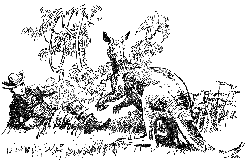 Во главе убегавшего стада несся самец футов в пять вышиной, великолепный экземпляр кенгуру-великана. Погоня продолжалась неустанно на протяжении четырех-пяти миль. Кенгуру не проявляли признаков усталости, а собаки, опасавшиеся — и не зря — могучих лап с острыми когтями, не очень-то старались к ним приблизиться. Но наконец, выбившись из сил, стадо остановилось, и кенгуру-великан, прислонясь к стволу дерева, приготовился к защите. Одна из собак в пылу погони подкатилась к самцу, но в тот же миг взлетела на воздух и свалилась на землю с распоротым брюхом. Конечно, и всей своре было бы не под силу справиться с этими могучими животными. Приходилось охотникам взяться за ружья — только пули могли прикончить их.