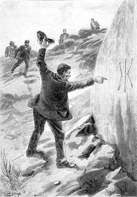 И вдруг раздался крик радости, более похожий на рев хищного зверя. Это ликовал дядюшка Антифер. В одной руке он держал шляпу, другой указывал на скалу, прямую, как надгробный памятник.