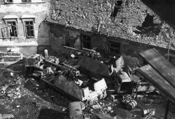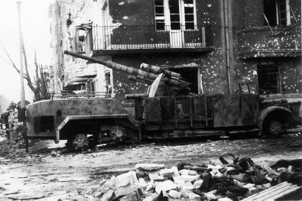 88-мм самоходная установка зенитной пушки Flak 36 на шасси трехосного автомобиля BUSSING-NAG, подбитая на улице в пригороде Будапешта. Февраль 1945 года. На стволе орудия видны кольца — количество сбитых самолетов противника (ЦАМО).