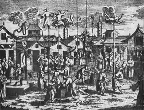 Три момента исполнения китайским фокусником трюка «индийский канат». Гравюра 1683 г.