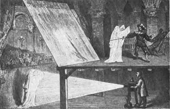 Чтобы выводить на сцену «живых» духов, был специально изобретен сложный оптический иллюзион. Анри Робен (голландец Дункель, 1805–1874), владелец парижского иллюзионного театра, установил на сцене в 1862 году огромное зеркальное стекло, наклоненное к зрителям под углом в сорок-пять градусов. Его края были закрыты кулисами, а верх — падугой.