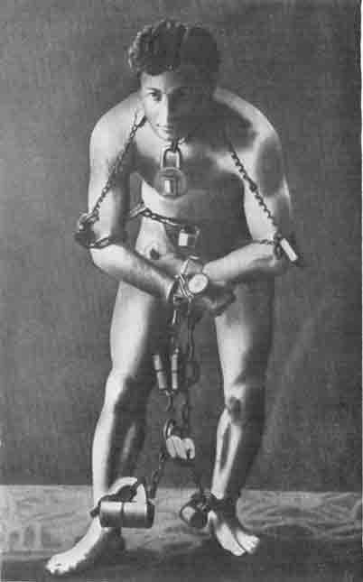 «Освобождение от оков» не было новым трюком. Его, как мы помним, исполнял еще в I веке «маг» Аполлоний Тианский, в XVI веке Колорнусу «удавалось освобождаться из любой тюрьмы, как бы прочна она ни была». С тех пор не раз встречались иллюзионисты, которые среди прочих трюков показывали необычайное освобождение от пут, цепей, из мешков и сундуков. Сравнительно незадолго до появления Гудини подобные трюки исполняли французы Рейнали и Диксон, немец Макс Рёсснер (Александр Макс, 1850–1906), англичанин Густав Фазола (Фергус Гринвуд, 1870–1929), Оуэн Кларк (1876–1929) и другие. Но особым успехом эти трюки не пользовались. Только колоссальный рост преступности в Соединенных Штатах Америки и детективная литература создали обстановку, в которой похождения уголовника приобретали налет романтики. Гудини показывал целую программу из однородных трюков и вызывал небывалый восторг публики.