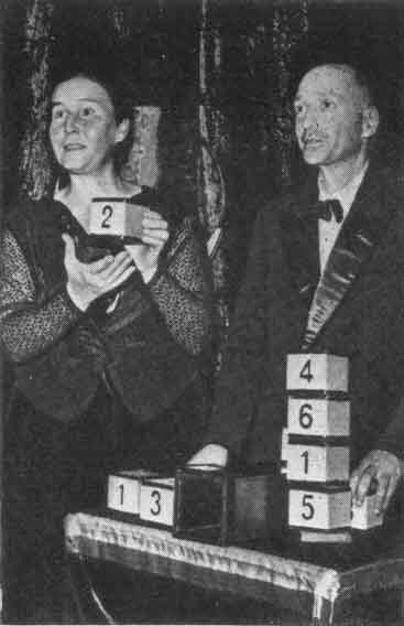 По-иному строится оригинальный номер мнемотехники В. и Н. Ростовцевых. Одному из партнеров зрители шепотом заказывают то или иное музыкальное произведение, другой играет эту мелодию, переходя от мотива к мотиву, «угадывая» пожелания зрителей.