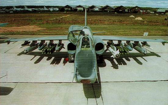 Под плоскостью крыла «строевого» Су-25 подвешено шестнадцать 100-кг бомб ФАБ-100 и УР Р-60. Боевая нагрузка производит впечатление.